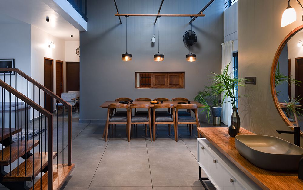 The ground floor features a spacious common area that opens up to the paddy field, providing a seamless transition between indoor and outdoor spaces. This area includes a living room, dining space, and a modern kitchen, all designed to promote family interaction and comfort. open spaces allow natural light to flood the interiors, creating a bright and welcoming atmosphere.